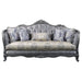 The Ariadne sofa collection is fit for royalty! The platinum finish of the wooden frame complements the lustrous upholstery over button-tufted seatback and inner armrests. Carved flourishes crown the arched seatbacks and extend down the molding around the high shelter armrests. Included with this set are accent pillows with floral patterns. Matching occasional tables complete this collection for a regal ambience.