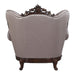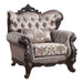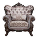 Enhance your formal living room with this elegant traditional 3-seater sofa. Part of the Wahkoowah collection, this sofa features an inner wooden frame that is sturdy. The outer wooden frame is finished with gold trimmings. Faux leather upholstery is used throughout the backrest and sides of the seats and armrests feature jacquard fabrics that accommodate the sofa. Five decorative throw pillows are included with this sofa.