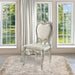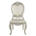 Add traditional glamour to your dining space with the Devayne side chairs. They are as comfortable as they are beautiful with their foam padded seats and backrest. Upholstered in sumptuous jacquard fabric for an added stylish touch. Floral moldings are present on the top of the backrests and on the legs and apron, nailhead trim is the perfect finish touch to these chairs.