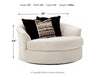 Let it snow. Doubling your pleasure with a spacious seating area with room for two—or just you—this oversized round swivel chair in a snow-tone neutral invites you to stretch your style in an easy-elegant way. Whether your aesthetic is urban hip or suburban chic, this posh swivel chair is sure to look and feel right at home. Wrapped in a chunky heavyweight chenille fabric with a delightful touch, this fashion-forward chair includes designer pillows for a brilliant pop of color and texture.