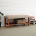 Simplistic lines pulling from the craftsman era and tapered legs to add some style, the Charla bench with button tufted full box seat can easily compliment any home styling Decor. The added width of the bottom slats serves as a function shelf. There are 4 fabric colors offered: Light gray, beige, blue, and gray.