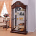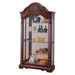The Denton Curio Cabinet will add beauty and design to any room. This detailed and stylish cabinet has tempered glass doors and shelves and is uniquely designed to be a welcome addition to your decorative collection.'This sophisticated cabinet in a warm cherry finish features a detailed bonnet top and palmetto carved accents adding a formal, traditional feeling to the cabinet.'The open glass shelves are the perfect place to display glassware or other collectables in a fashionable way. This curio cabinet is a compliment to any home.