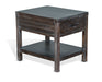 This Sunny Designs end table features a distressed, kettle black finish that adds a hint of beauty and style to your living space. Made from mindi solids and veneers, this end table is strong and durable for long-lasting usage. The lower shelf offers ample room for magazines, photo albums, and other decorative items. It also features felt-lined drawers with full extension drawer guides and decorative hardware.