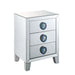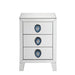 Assembled, Rectangular Night Table • Mirrored Finish: Beveled (Back Unfinished) • Orientation: Free Standing • Storage: 3 Drawers (Open Base) •• CONSTRUCTION •• Mirrored Case-Frame & Drw: Mirror, MDF (Fixed Top) • Mirrored Tapered Leg, Leg Size: 4 Inches Height •• Drawer: GLIDE Side Metal (Ext. 2/3), Dovetail French Front, Felt-Lined Not Included, Safety Stop Not Included, Manual Close, Hardware: Faux Agate, Single Knob, Drawer Size: 13" x 12" x 5"H
