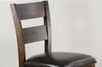 This ladder-back dining chair features a black vinyl cushion seat. Constructed with wire-brushed wooden frame legs and rustic charm, this side chair is the best way to introduce a fresh look to your dining room. The wood H-stretcher add durability to enjoy for years to come.