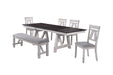 The Maisie Wood Dining Set combines quality construction with modern rustic style, making it a perfect addition to any dining space. This set includes a two-tone dining table with self-storing leaves and dining chairs. Crafted from solid rubberwood, manufactured woods, and Mindy wood veneers, this dining set is built to last. The table features a dark brown tabletop that contrasts beautifully with slightly distressed base and chairs, enhancing its farmhouse appeal. The chairs are designed for comfort, with resilient foam cushions wrapped in an easy-care polyester/cotton blend fabric. The expanding table, which can seat up to eight people with its two 14" self-storing leaves, is ideal for hosting family gatherings. The Maisie Dining Set seamlessly blends rustic charm with modern design, creating a dining space that feels both fresh and timeless. This set is a smart investment for those looking to combine style, comfort, and functionality in their dining area.
