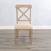 This farmhouse-style dining chair features an X-back design that makes a sophisticated statement. The chair features a solid mahogany structure and a comfortable padded seat upholstered in a linen fabric.