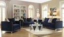 The Phaedra sofa is an ideal choice for any living room. This blue upholstered sofa features decorative Nailhead trim, pocket coil seating, tight back and loose seat cushions. Five duck feather filled pillows are included for better and comfortable back support. Strength and beauty is guaranteed with a metal frame base and sliver stainless steel legs. This sofa will become the most relaxing area in your fast-paced life. Fully Assembled.