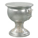 A luxurious antique silver finish with hand-brushed gold accents makes up the Sandoval nightstand. Surrounded by fine Rococo scrolls and floral ornament crowns with stylized ribbons. Featuring two convenient storage drawers and a single pedestal base for a modern appeal. The table top has enough room for a lamp, books, and a carafe.