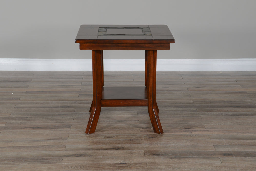 This Santa Fe End Table with slate inlay is a traditional design that was crafted with distressed mahogany solids and veneers. The table has one storage shelf and the tabletop has beautiful slate inlays.