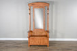 This Sedona hall tree was built with distressed mahogany solids and veneers, railroad spike hangers, storage under the seat and finish in a Rustic Oak finish.