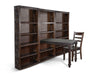 This desk has mindi top, mahogany base solids, and veneers. Works well in small spaces and was finished in European Dark finish.
