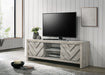 This bedroom collection encapsulates a blend of contemporary design and rustic charm. The centerpiece, a bed with a distinguished chevron patterned headboard, evokes a sense of craftsmanship and texture, infusing the space with character. Flanking the bed are matching pieces, each exhibiting clean lines and a finish that suggests a lived-in elegance. The dresser, complemented by a substantial mirror, along with the tall chest, offer ample storage solutions with understated metal handles that enhance the modern farmhouse aesthetic. A nightstand completes the set, its compact design making it a practical addition to the suite.