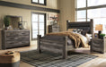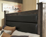 Rustic planked replicated oak grain with authentic touch. Large scaled dark colored hooded pull. Sticks across headboard give a thick planked look. Side roller glides for smooth operating drawers. Cases feature a framed front and pilasters. Large drawers provide ample storage space. Slim profile dual USB charger located on the back of the night stand tops. Queen (67) and king (68) poster headboards feature an upholstered panel with horizontal channel details.